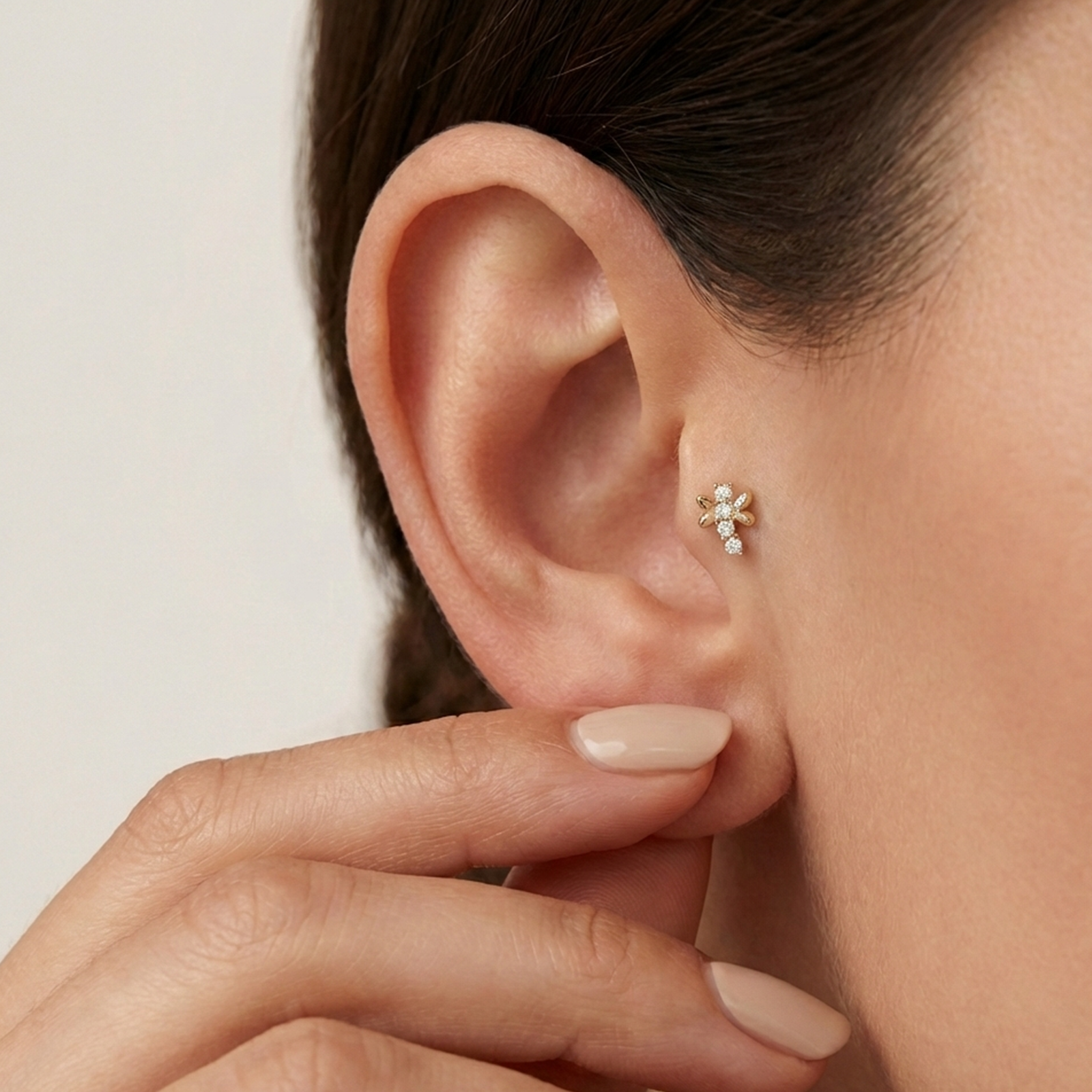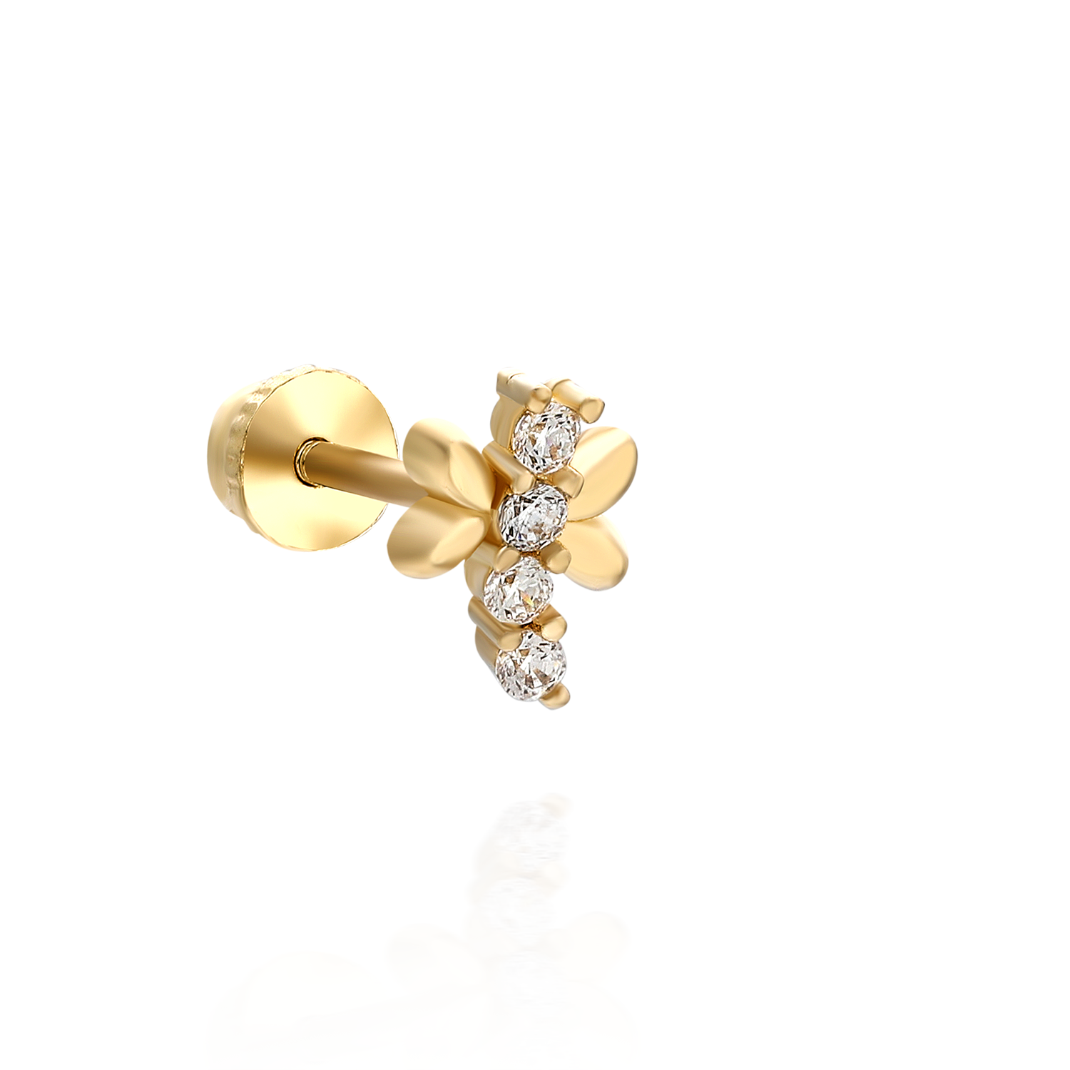 Zarafetin en hafif ve göz alıcı uçuşu. Golden Dragonfly, dikey olarak sıralanmış dört adet parlak kristal taştan oluşan ışıltılı gövdesi ve iki yana açılan pürüzsüz altın (gold) kanatlarıyla büyüleyici bir denge sunuyor. Kristallerin ışığı kıran yapısı ile altının yalın dokusu arasındaki bu kontrast, tasarıma hem hareket hem de lüks bir derinlik katar. Tragus, helix veya kulak memesi (lobe) için tasarlanan bu parça; kulağınıza konmuş, her an havalanmaya hazır, zarif bir doğa harikası gibi durur.