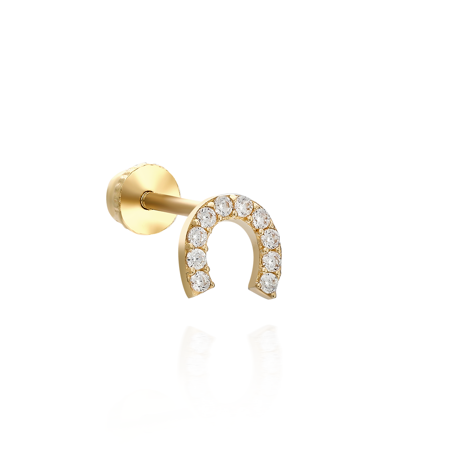 Şansın en ışıltılı ve zarif hali. Golden Fortune Tragus, klasik at nalı (horseshoe) figürünü, sarı altının (gold) sıcak parıltısıyla sunar. Kavisli yüzeyi boyunca özenle dizilmiş parlak kristal taşlar, bu kadim uğur sembolüne modern ve lüks bir ışıltı katar. Helix, tragus veya kulak memesinde (lobe) taşıyacağınız bu zarif tılsım, sadece şıklığınızı değil, pozitif enerjinizi de yansıtacak.