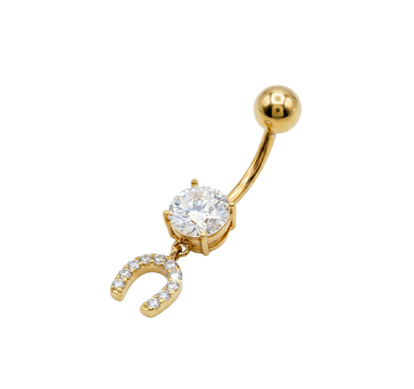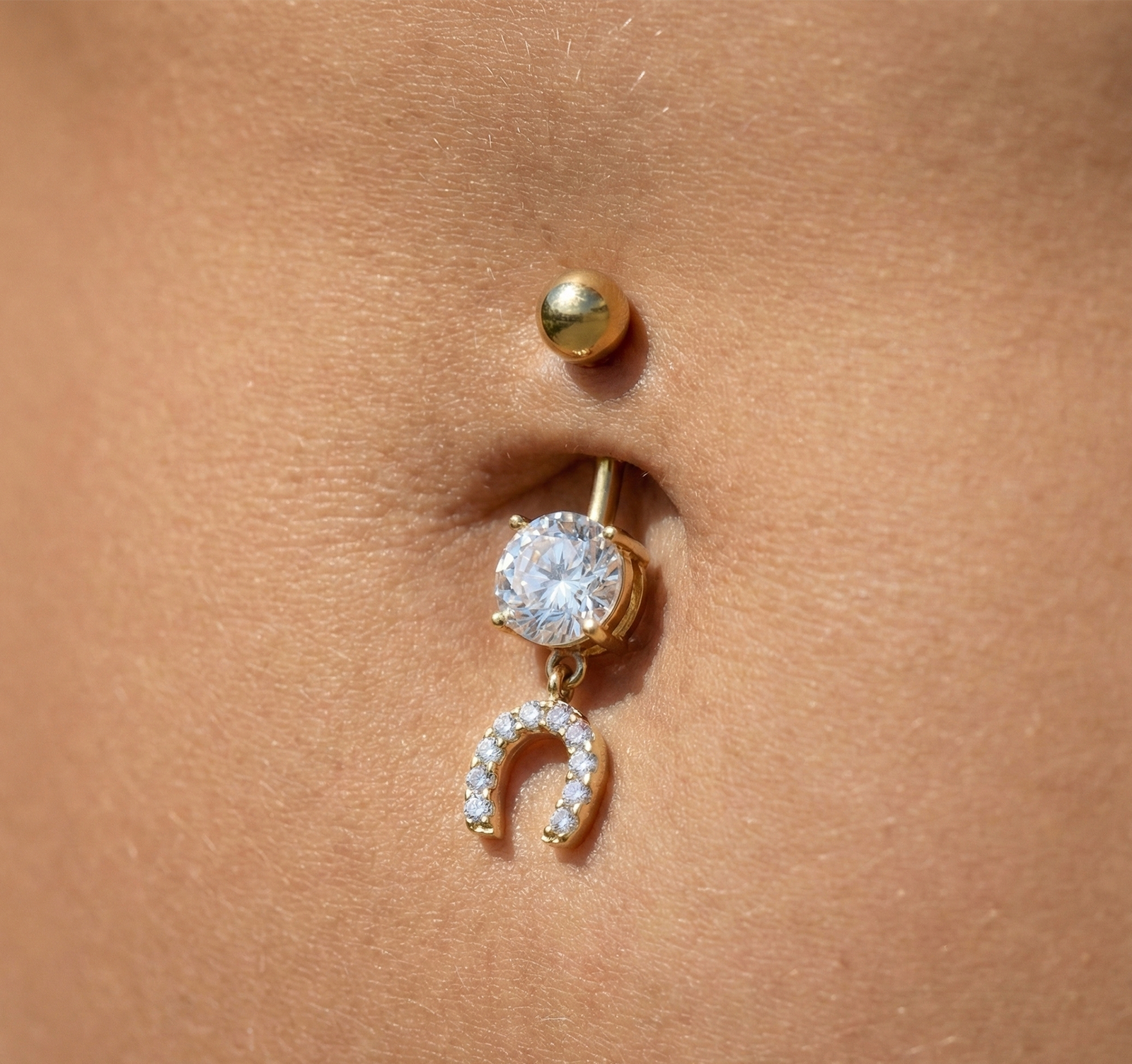 Zirkon taşlı, sallantılı kelebek tasarımlı gold göbek piercingi. Işıltılı görünümü ve modern kesimiyle her kombinin en şık tamamlayıcısı.