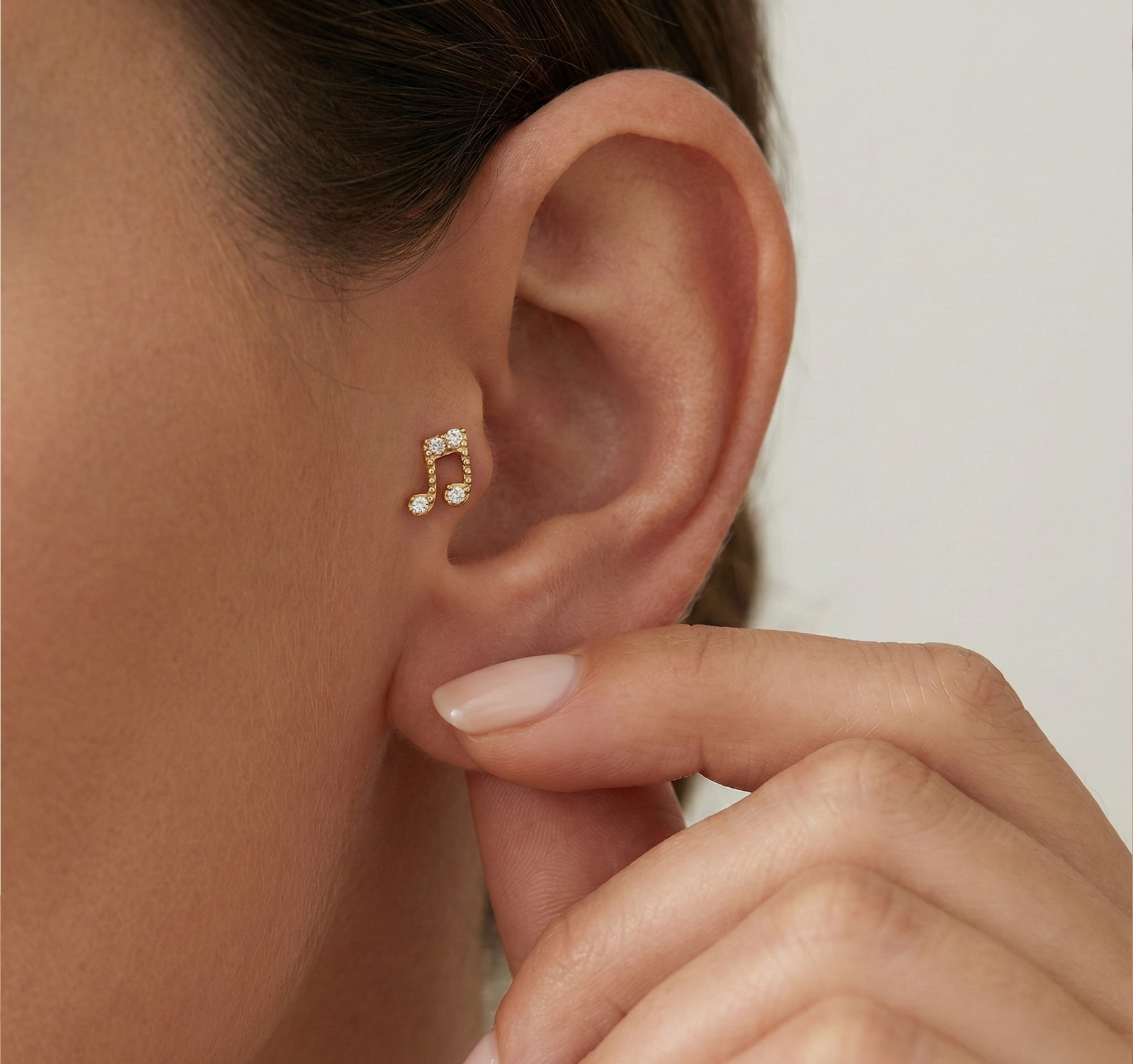 Hayatın ritmini kulağınızda taşıyın. Golden Melody, müziğin evrensel dilini mücevher şıklığıyla buluşturuyor. Çiftli nota figürünün sap ve kiriş kısımları, kristal taşların ince işçiliğiyle bezenerek ışıltılı bir porte yaratıyor. Müziğe tutkun ruhlar için tasarlanan bu parça; tragus, helix veya lobe bölgenizde her an size eşlik edecek zarif bir melodi gibi parıldar.