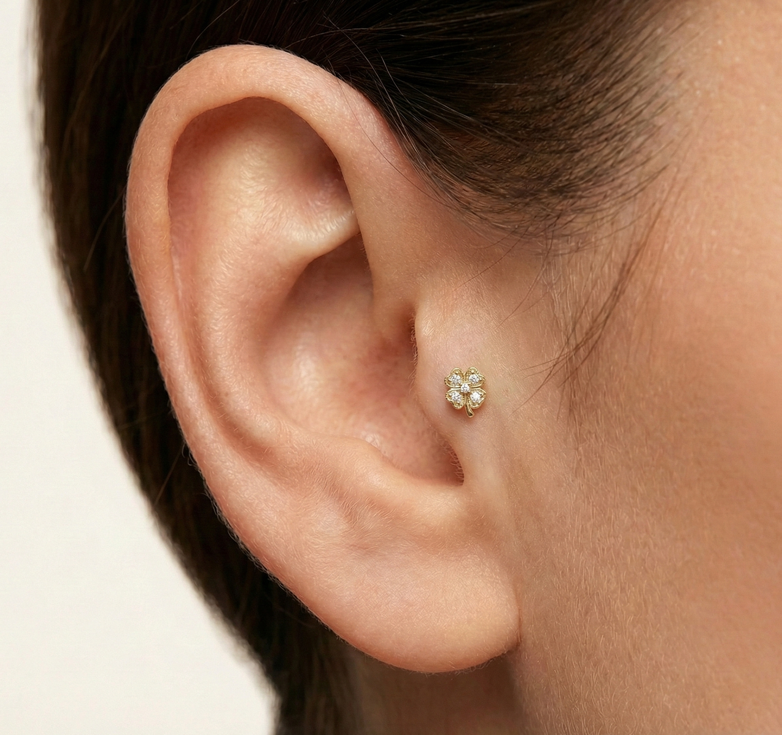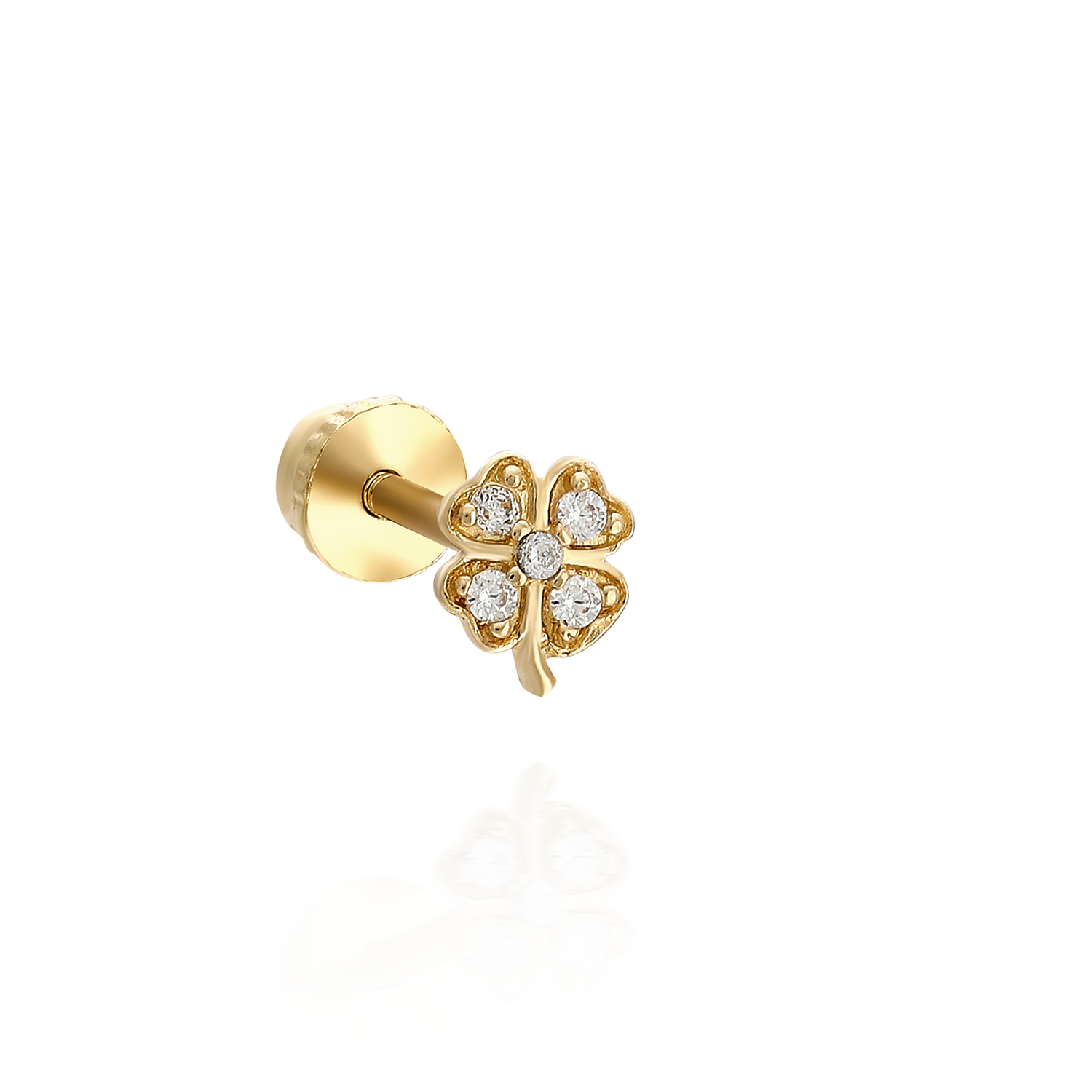 Şansın en ışıltılı tılsımı. Crystal Clover, efsanevi dört yapraklı yonca figürünü, her bir yaprağına işlenen kristal taşlarla modern bir mücevhere dönüştürüyor. Belirgin sap detayı, kalp formundaki yaprakları ve altın çerçevesiyle hem doğanın zarafetini hem de iyi şansın enerjisini taşır. Kulağınızda (tragus, helix veya lobe) her daim yanınızda olacak, zarif bir uğur.